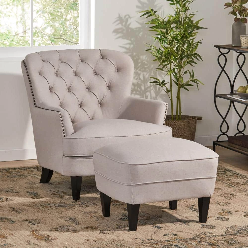 This club chair ottoman set is ideal for any room in your home. With a perfectly designed ottoman to match this club chair, you will be lounging in style. The studded outline of the chair adds the perfect amount of flair to compliment the tufted seat back and plush cushions. Both the club chair and the ottoman have cushions to promote the maximum amount of comfort while in use. This set is great for any room, especially your living room.