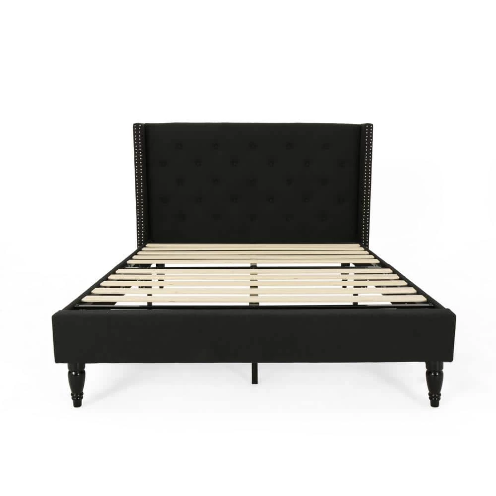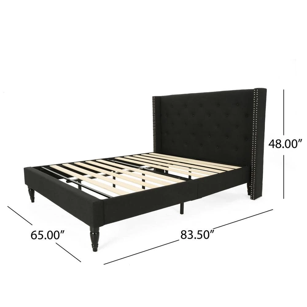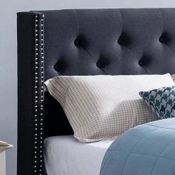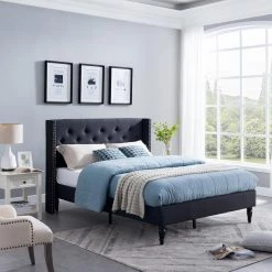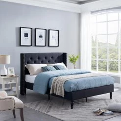 An elegant homage to traditional convention, this bed frame features shallow button-tufting, hand-placed nailhead accents, and classic turned legs. The low profile of the platform is juxtaposed with a high-back headboard and sophisticated wings at either end. This bed frame is constructed with strong slats, providing adequate support for any box spring or memory foam queen-size mattress.