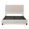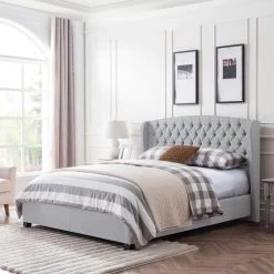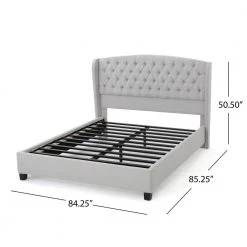 This full king-size platform bed frame carries with it an air of serene dignity that will bring your bedroom living space back to life. Traditional details such as a pleated and button-tufted floating headboard and a low-profile body make this sophisticated selection an essential in any home. This bed frame prevents your mattress from sagging or becoming indented over time.