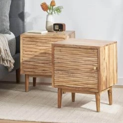 Add style and texture to your interior space with an eye-catching accessory set of innovative design. Featuring a rich mango wood structure for a one-of-a-kind design, our nightstand set brings a stunning bohemian look to your home, complemented by a beautifully carved texture and tapered legs. These handcrafted nightstands are the perfect companions to any living space with their one-door cabinet space for storing and organizing your clutter. Blending seamlessly with your existing decor, these accessories bring a perfect amount of stylish function and carefree aesthetics to your bedside.